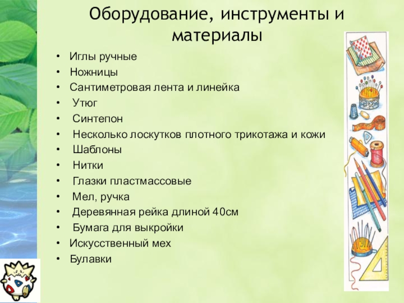 Слайд 11Оборудование, инструменты и материалы