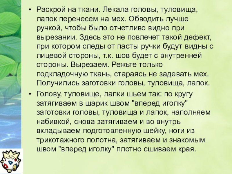 Голову, туловище, лапки шьем так: по кругу затягиваем в шарик швом "вперед иголку" заготовки головы, туловища и лапок, наполняем набивкой, снова затягиваем и во внутрь вкладываем подготовленную шейку, ноги из трикотажного полотна, затягиваем и знакомым швом "вперед иголку" плотно сшиваем края.