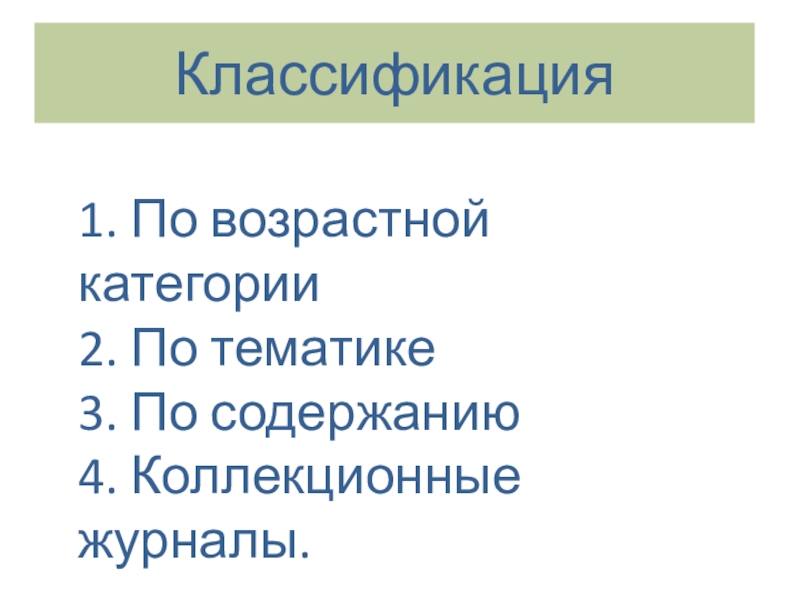 1. По возрастной категории  2. По тематике  3. По содержанию  4. Коллекционные журналы.Классификация