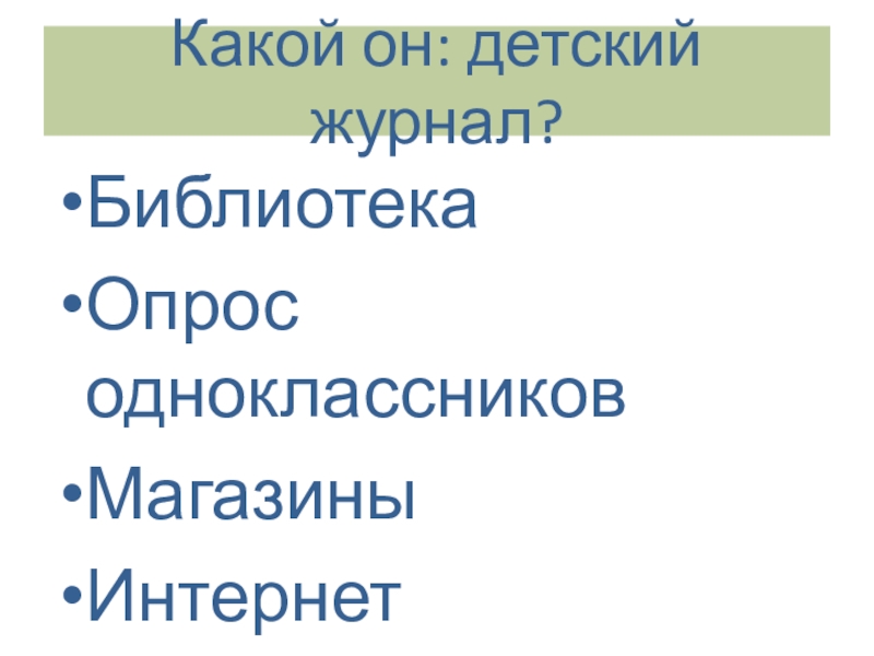 Какой он: детский журнал?БиблиотекаОпрос одноклассниковМагазиныИнтернет