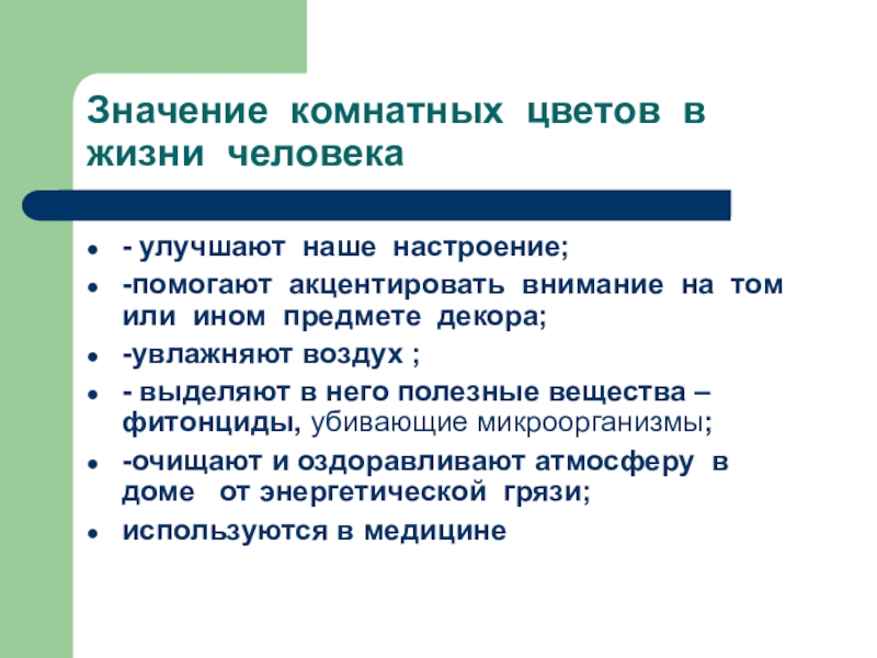 Значение комнатных цветов в жизни человека- улучшают наше настроение;-помогают акцентировать внимание на том или ином предмете декора;-увлажняют