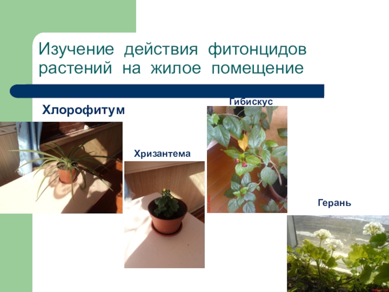 Изучение действия фитонцидов растений на жилое помещениеХлорофитумГибискусГераньХризантема
