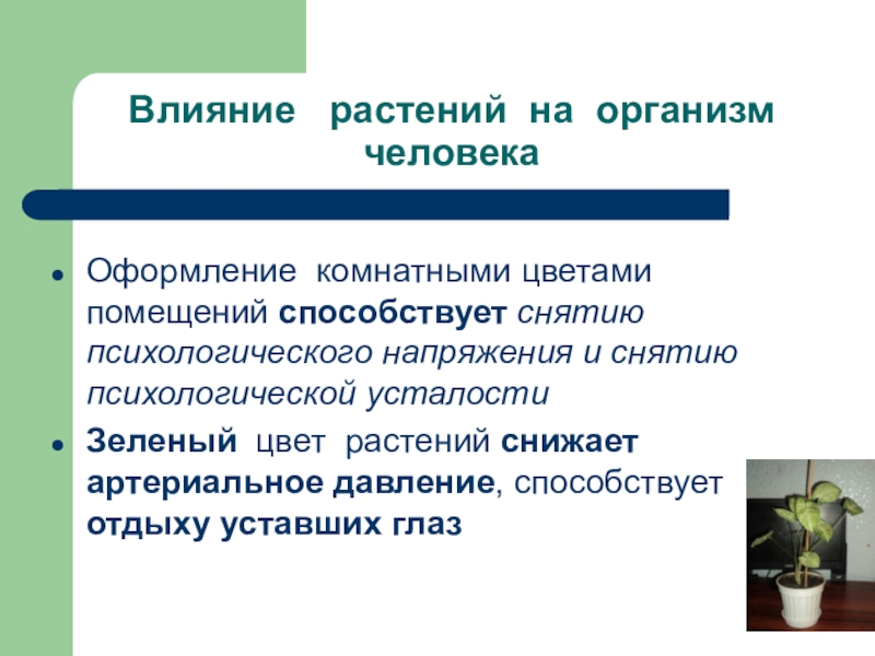 Влияние  растений на организм человекаОформление комнатными цветами помещений способствует снятию психологического напряжения и снятию психологической усталости