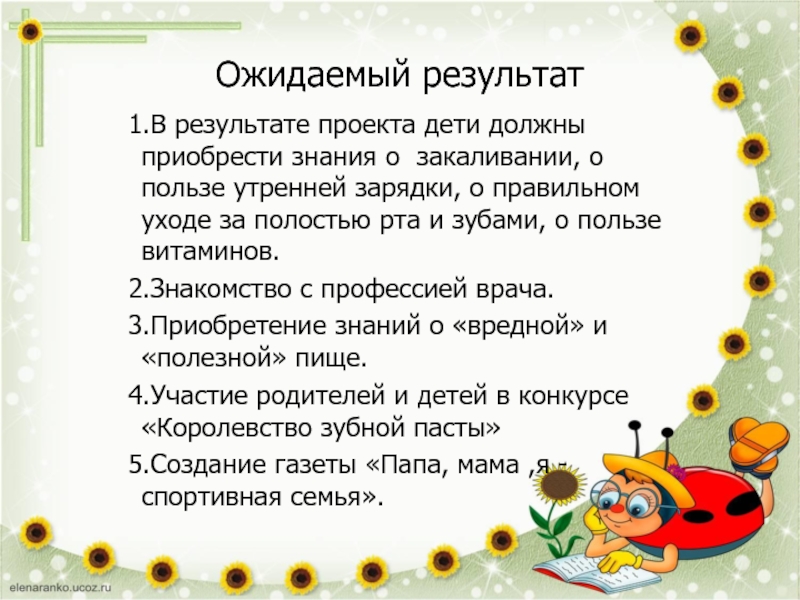 Ожидаемый результат 1.В результате проекта дети должны приобрести знания о закаливании, о пользе утренней зарядки, о правильном