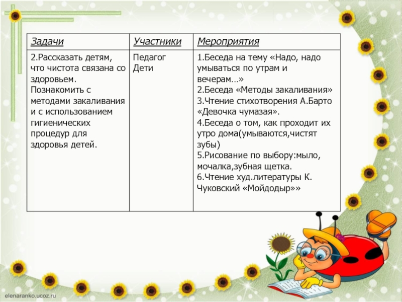 Цель: Дать представление детям, что здоровье играет важную роль в жизни ребенка. Рассказать детям, что чистота связана со здоровьем. Познакомить детей с методами закаливания, с правильным уходом за полостью рта и зубами, рассказать детям о пользе утренней зарядки и о правильном соблюдении режима дня. Привлечь родителей к соблюдению режимных моментов.