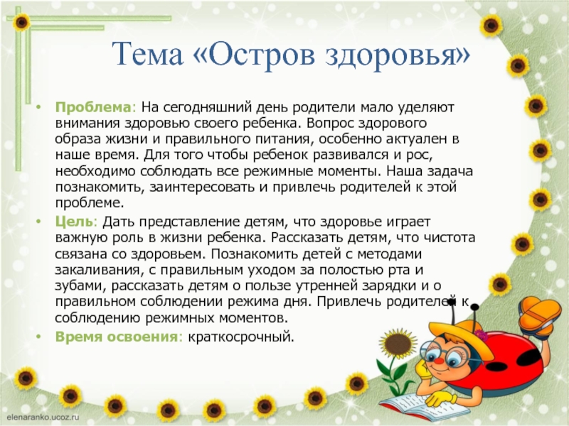 Тема «Остров здоровья»Проблема: На сегодняшний день родители мало уделяют внимания здоровью своего ребенка. Вопрос здорового образа жизни