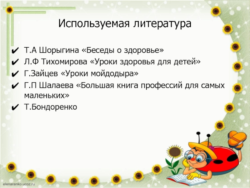 Используемая литератураТ.А Шорыгина «Беседы о здоровье»Л.Ф Тихомирова «Уроки здоровья для детей»Г.Зайцев «Уроки мойдодыра»Г.П Шалаева «Большая книга профессий