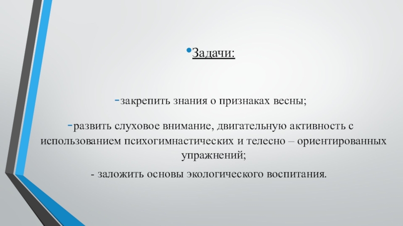 Задачи: закрепить знания о признаках весны;развить слуховое внимание, двигательную активность с использованием психогимнастических и телесно – ориентированных упражнений; - заложить основы экологического воспитания.