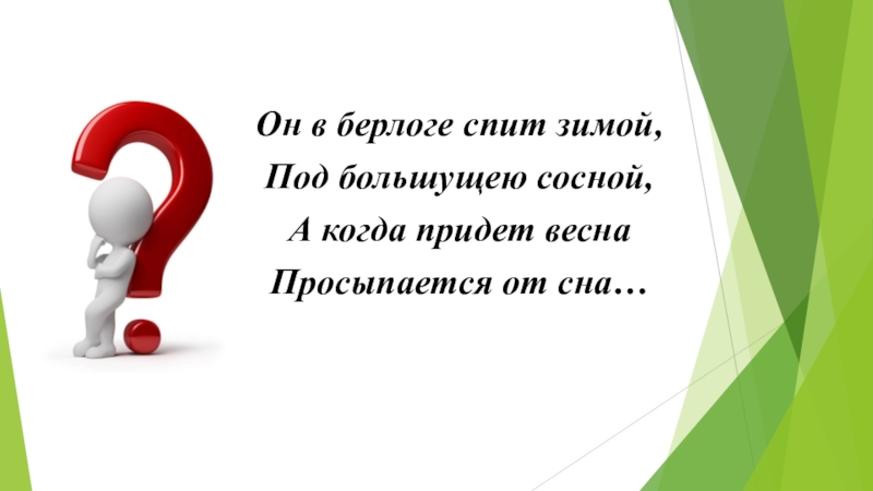 Он в берлоге спит зимой,Под большущею сосной,А когда придет веснаПросыпается от сна…