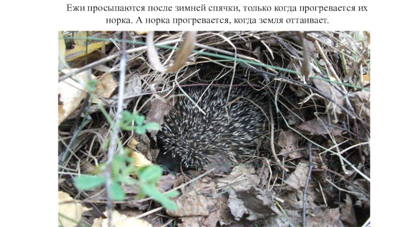 Слайд 14Ежи просыпаются после зимней спячки, только когда прогревается их норка. А