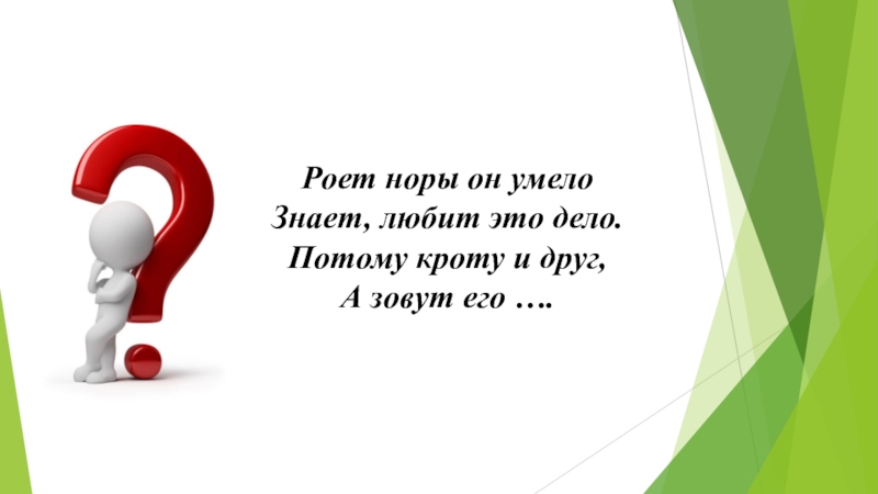 Слайд 10Роет норы он умело Знает, любит это дело. Потому кроту и друг, А зовут
