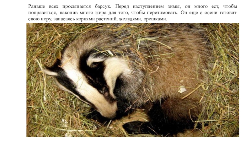 Слайд 11Раньше всех просыпается барсук. Перед наступлением зимы, он много ест, чтобы
