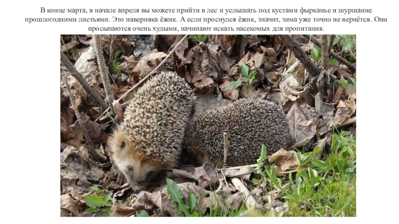 и услышать под кустами фырканье и шуршание прошлогодними листьями. Это наверняка ёжик. А если проснулся ёжик, значит, зима уже точно не вернётся. Они просыпаются очень худыми, начинают искать насекомых для пропитания.