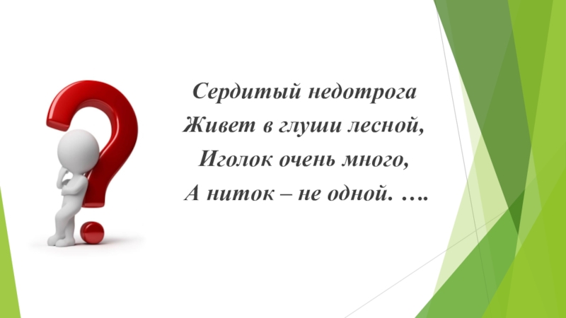 Сердитый недотрогаЖивет в глуши лесной,Иголок очень много, А ниток – не одной. ….