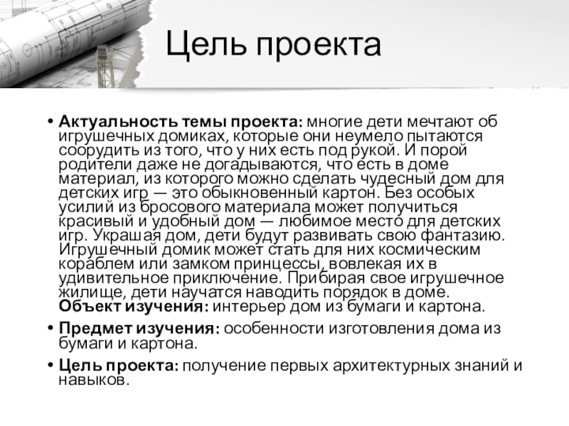 Актуальность темы проекта: многие дети мечтают об игрушечных домиках, которые они
