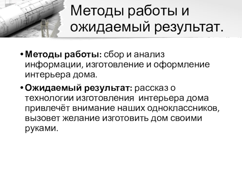 Ожидаемый результат: рассказ о технологии изготовления интерьера дома привлечёт внимание наших одноклассников, вызовет желание изготовить дом своими руками.
