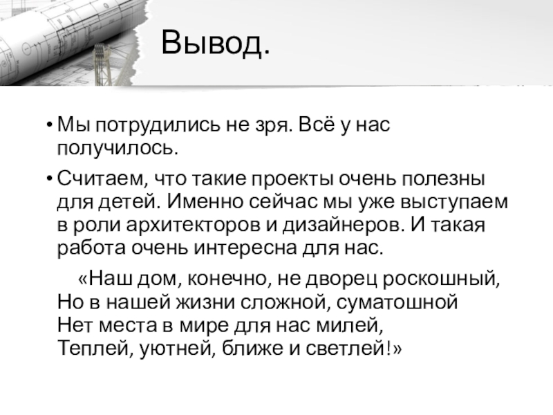 очень полезны для детей. Именно сейчас мы уже выступаем в роли архитекторов и дизайнеров. И такая работа очень интересна для нас.
