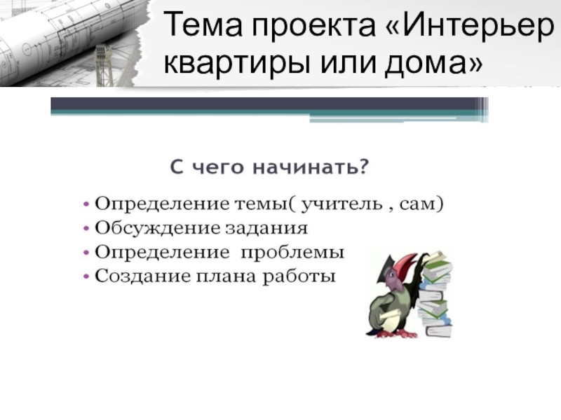 Слайд 6Тема проекта «Интерьер квартиры или дома»
