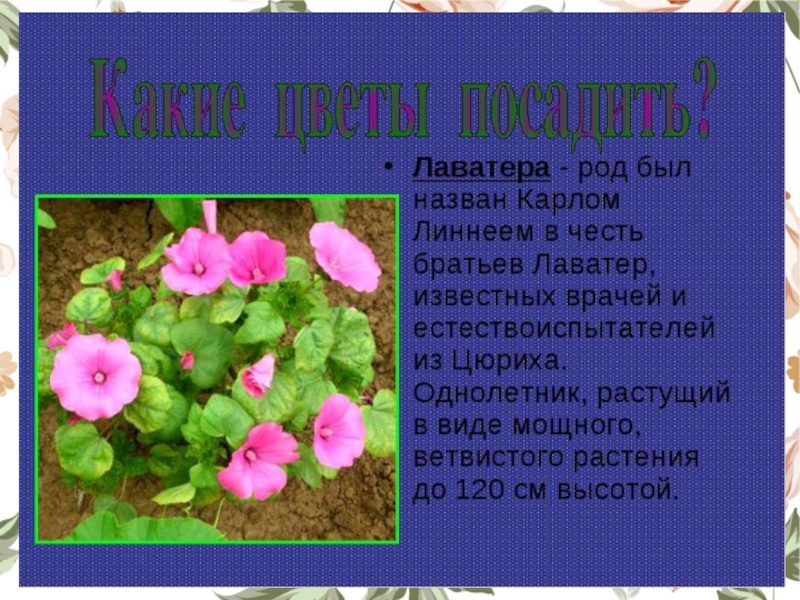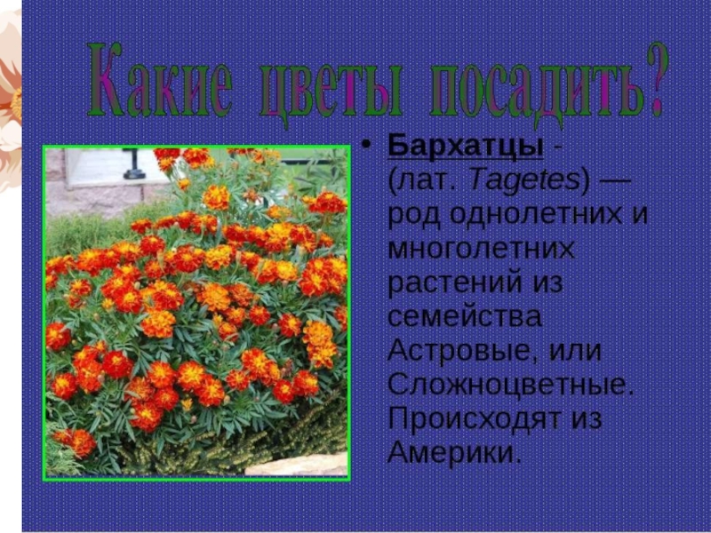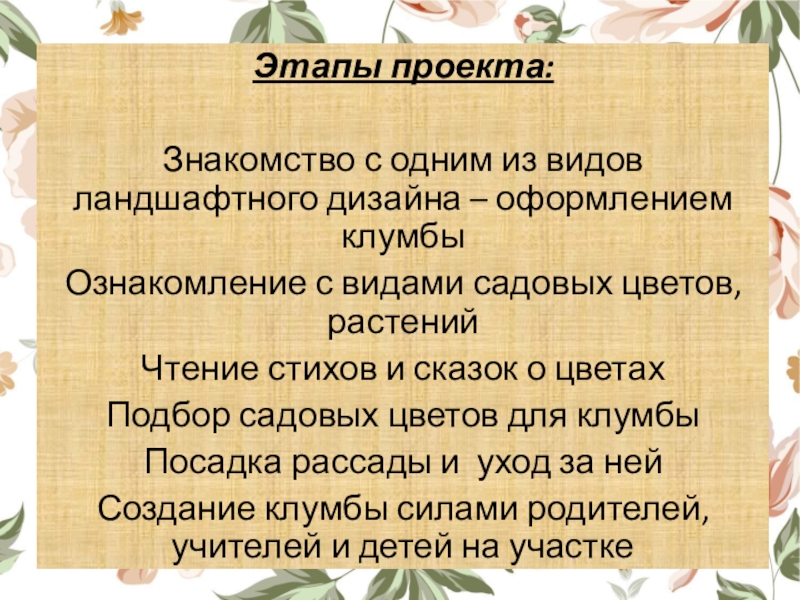 Этапы проекта:Знакомство с одним из видов ландшафтного дизайна – оформлением клумбыОзнакомление с видами садовых цветов, растенийЧтение стихов