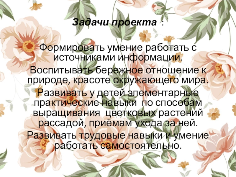 Задачи проекта :Формировать умение работать с источниками информации.Воспитывать бережное отношение к природе, красоте окружающего мира.Развивать у детей