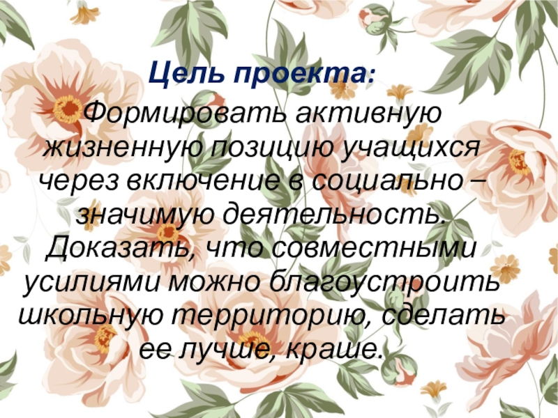 Цель проекта:Формировать активную жизненную позицию учащихся через включение в социально – значимую деятельность. Доказать, что совместными усилиями можно благоустроить школьную территорию, сделать ее лучше, краше.
