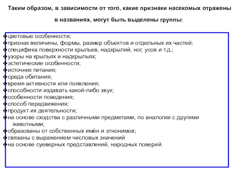 Таким образом, в зависимости от того, какие признаки насекомых отражены в