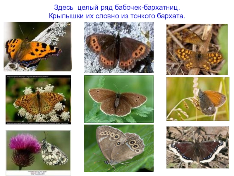 Слайд 32Здесь целый ряд бабочек-бархатниц.