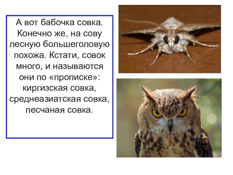Слайд 17А вот бабочка совка. Конечно же, на сову лесную большеголовую похожа.