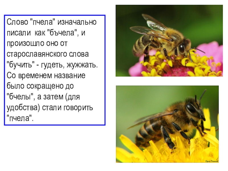 Слайд 37Слово "пчела" изначально писали как "бъчела", и произошло оно от старославянского