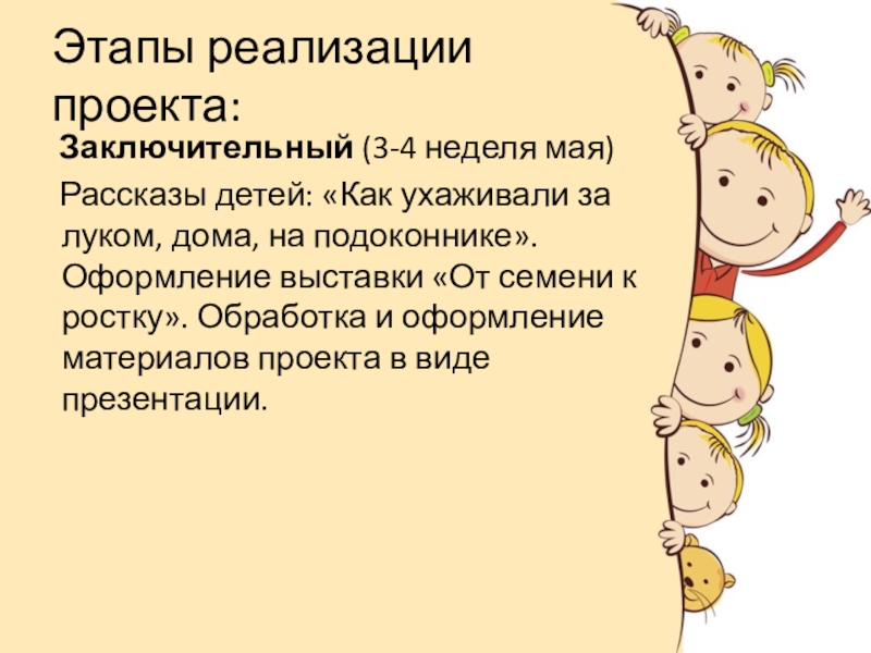 «Как ухаживали за луком, дома, на подоконнике». Оформление выставки «От семени к ростку». Обработка и оформление материалов проекта в виде презентации.