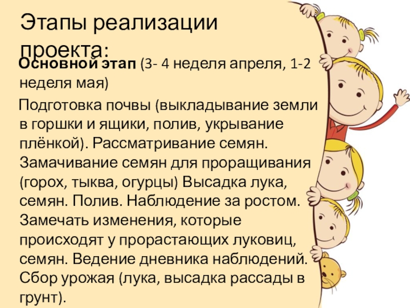 Подготовка почвы (выкладывание земли в горшки и ящики, полив, укрывание плёнкой). Рассматривание семян. Замачивание семян для проращивания (горох, тыква, огурцы) Высадка лука, семян. Полив. Наблюдение за ростом. Замечать изменения, которые происходят у прорастающих луковиц, семян. Ведение дневника наблюдений. Сбор урожая (лука, высадка рассады в грунт).