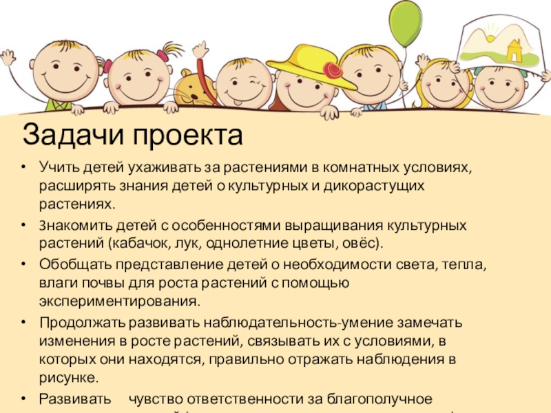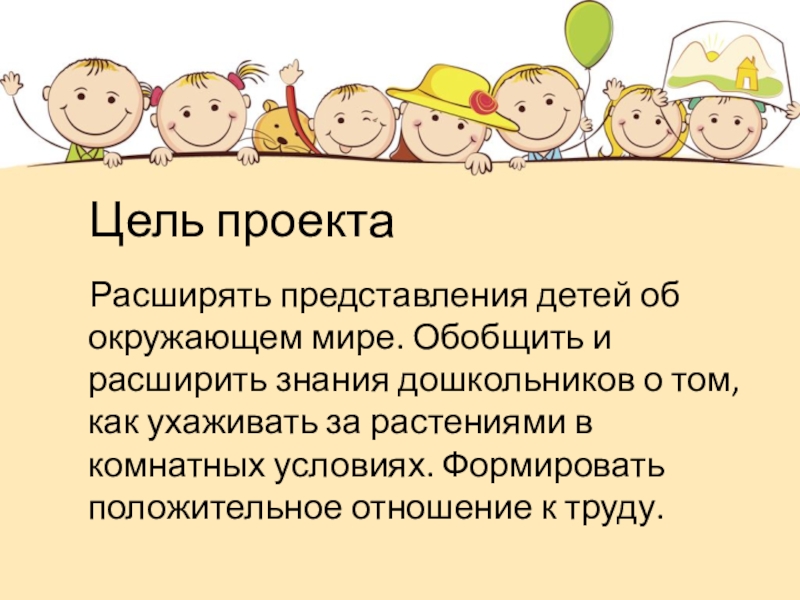 Обобщить и расширить знания дошкольников о том, как ухаживать за растениями в комнатных условиях. Формировать положительное отношение к труду.