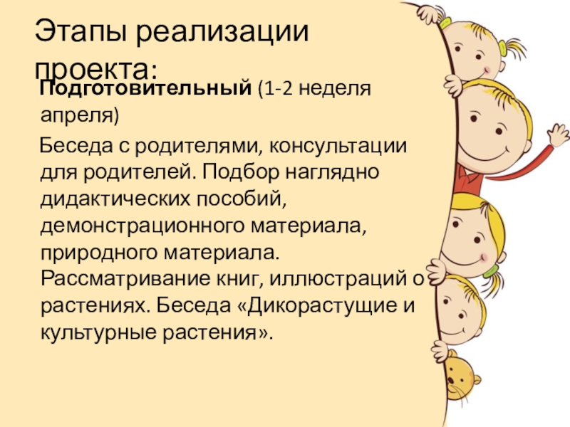 родителями, консультации для родителей. Подбор наглядно дидактических пособий, демонстрационного материала, природного материала. Рассматривание книг, иллюстраций о растениях. Беседа «Дикорастущие и культурные растения».