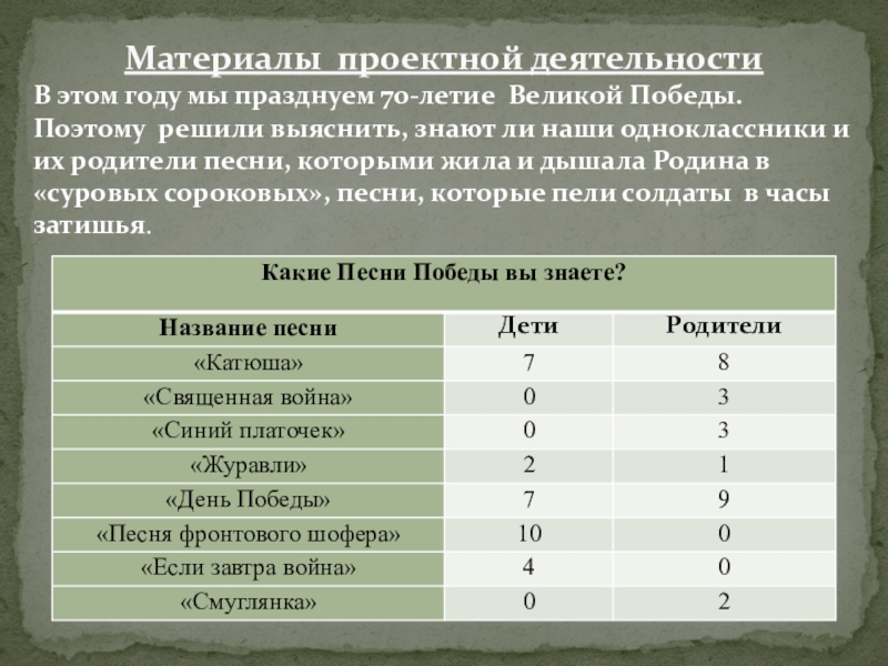 Объект исследования: песни периода Великой Отечественной войны.