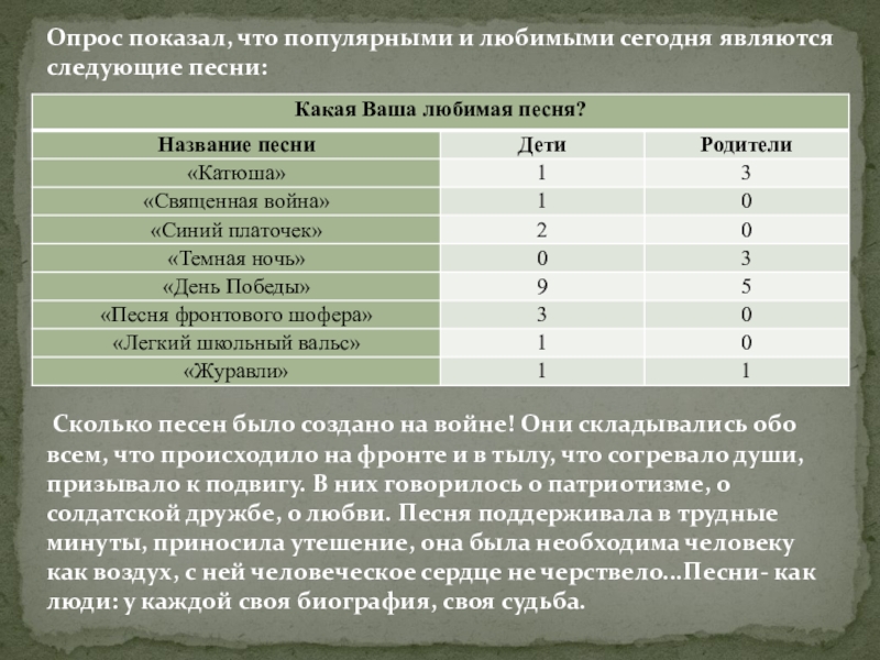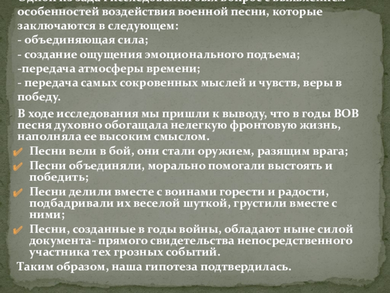 Одной из задач исследования был вопрос с выявлением особенностей воздействия военной песни, которые заключаются в следующем: