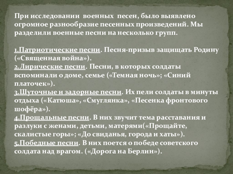 высказывающие самые сокровенные мысли и чувства («Темная ночь»).Осознание горя, причиненного войной рождало песни-драмы («Враги сожгли родную хату»).Шуточные и задорные песни придавали сил ( «Мишка-одессит»).Песня-слава звучала в победном 1945 году («Дорога на Берлин»).