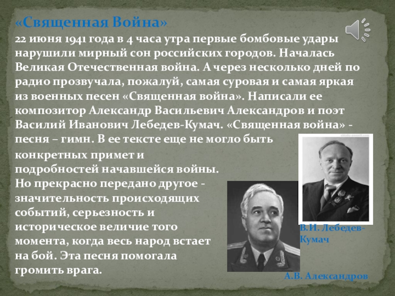 конкретных примет и подробностей начавшейся войны. Но прекрасно передано другое - значительность происходящих событий, серьезность и историческое величие того момента, когда весь народ встает на бой. Эта песня помогала громить врага.
