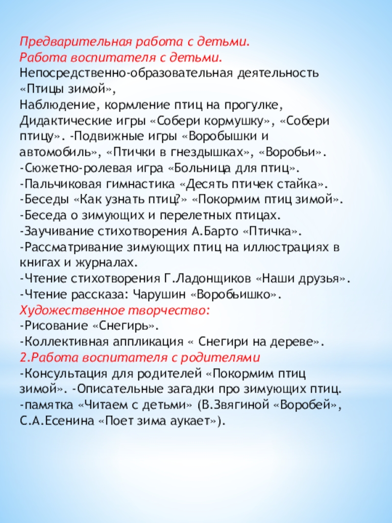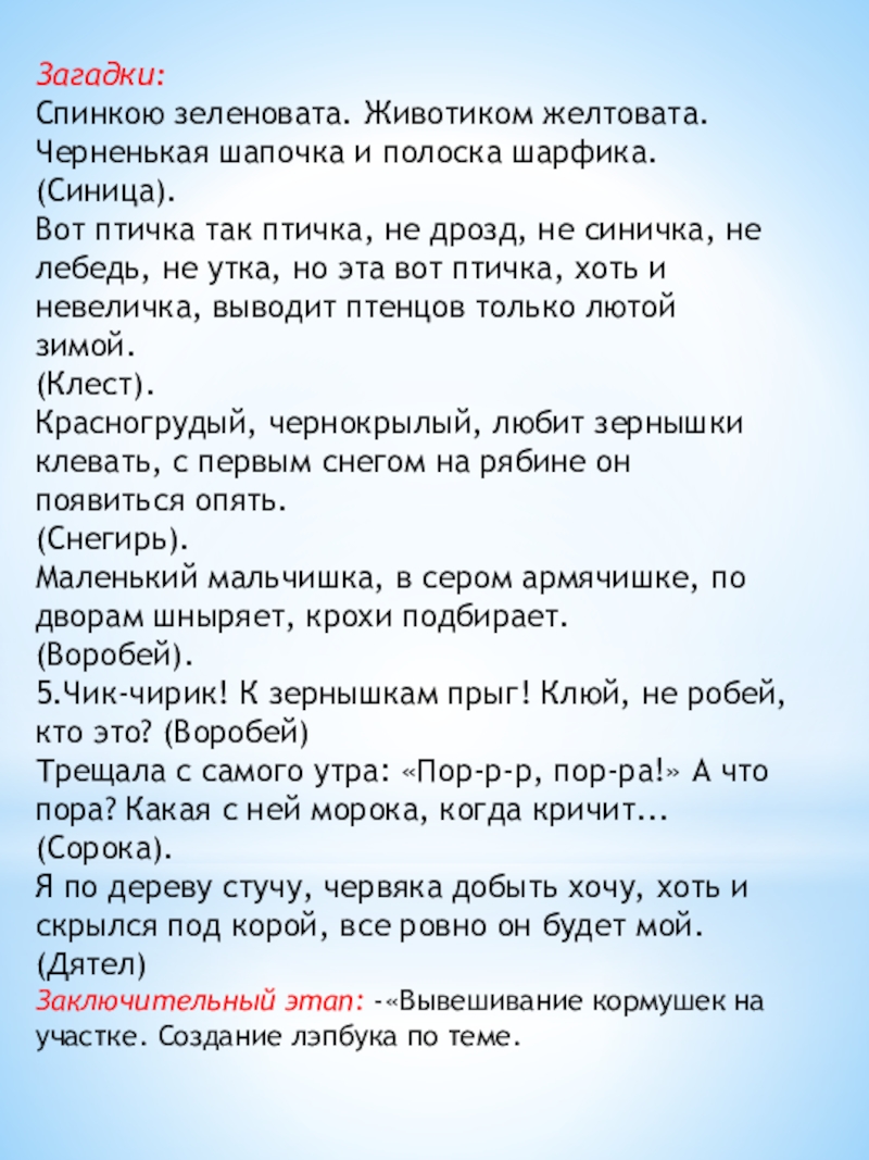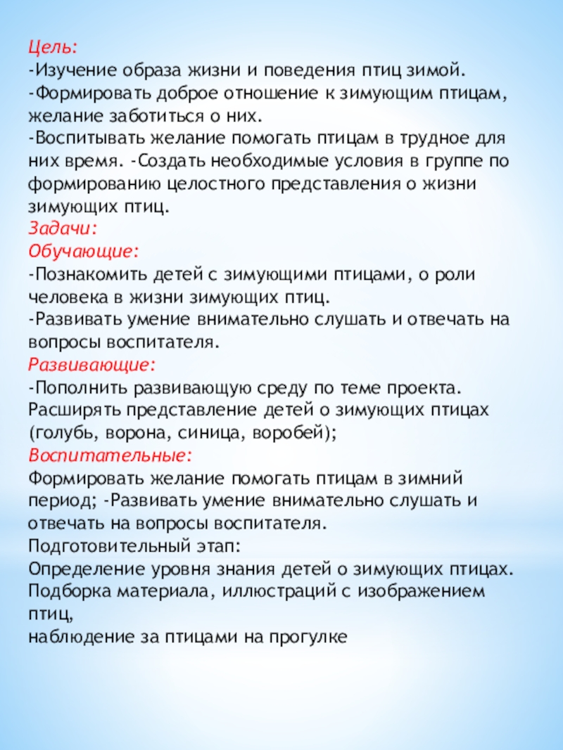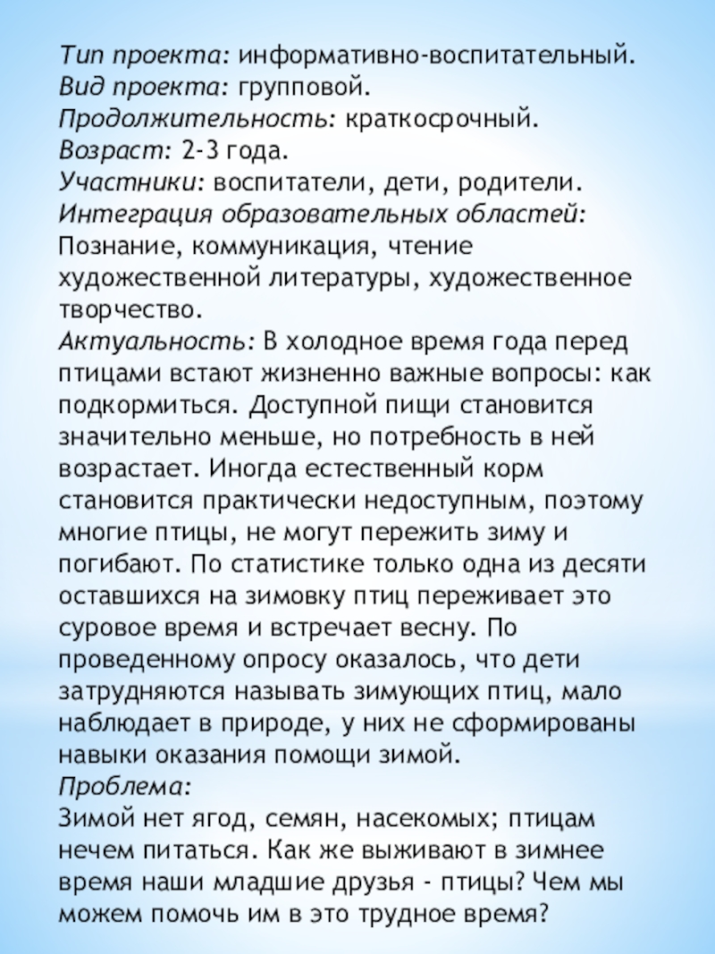 Актуальность: В холодное время года перед птицами встают жизненно важные вопросы: как подкормиться. Доступной пищи становится значительно меньше, но потребность в ней возрастает. Иногда естественный корм становится практически недоступным, поэтому многие птицы, не могут пережить зиму и погибают. По статистике только одна из десяти оставшихся на зимовку птиц переживает это суровое время и встречает весну. По проведенному опросу оказалось, что дети затрудняются называть зимующих птиц, мало наблюдает в природе, у них не сформированы навыки оказания помощи зимой.