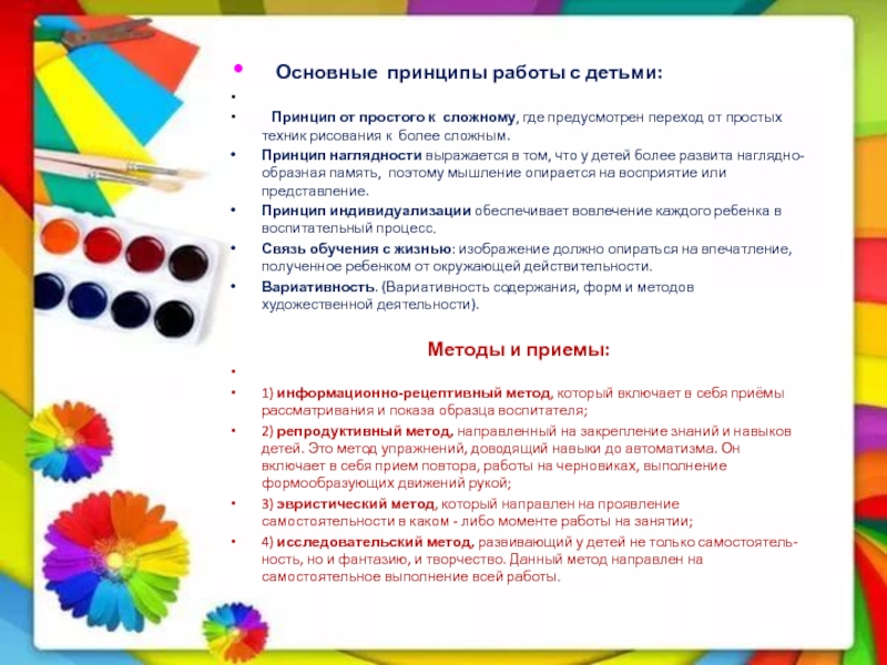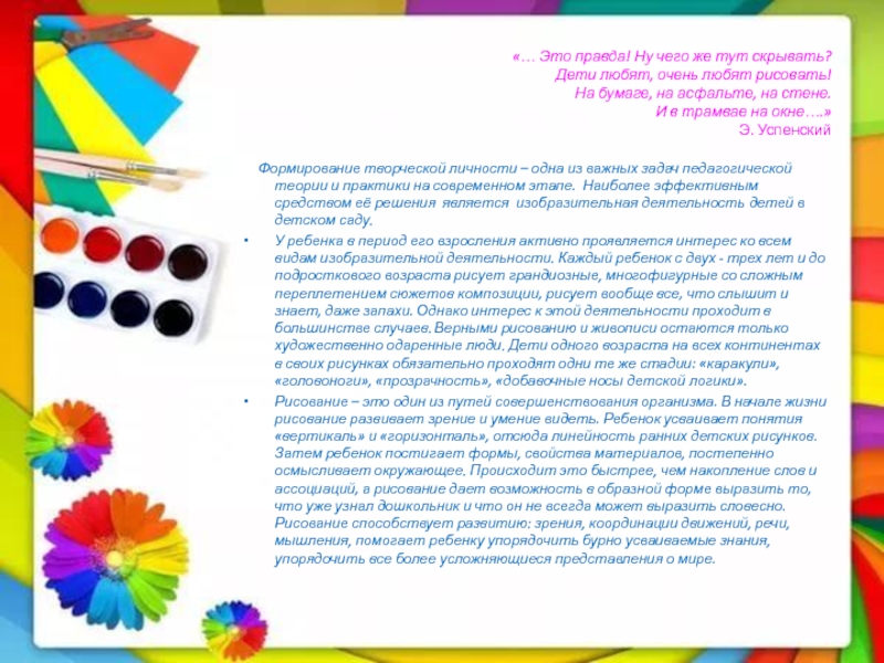 Рисование – это один из путей совершенствования организма. В начале жизни рисование развивает зрение и умение видеть. Ребенок усваивает понятия «вертикаль» и «горизонталь», отсюда линейность ранних детских рисунков. Затем ребенок постигает формы, свойства материалов, постепенно осмысливает окружающее. Происходит это быстрее, чем накопление слов и ассоциаций, а рисование дает возможность в образной форме выразить то, что уже узнал дошкольник и что он не всегда может выразить словесно. Рисование способствует развитию: зрения, координации движений, речи, мышления, помогает ребенку упорядочить бурно усваиваемые знания, упорядочить все более усложняющиеся представления о мире.
