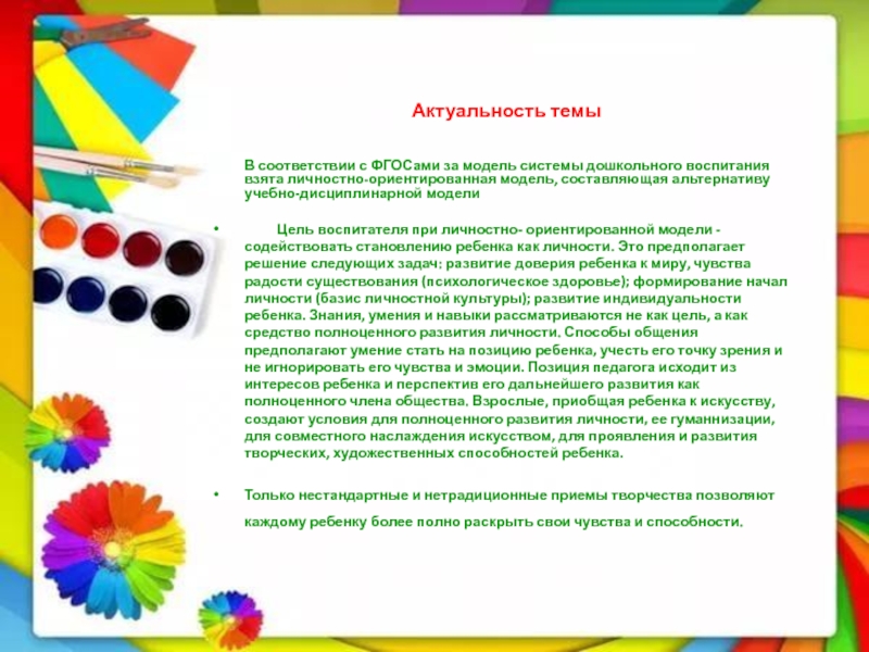Формирование творческой личности – одна из важных задач педагогической теории и практики на современном этапе. Наиболее эффективным средством её решения является изобразительная деятельность детей в детском саду.