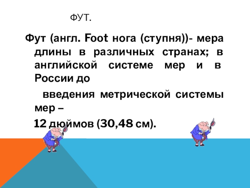 Фут (англ. Foot нога (ступня))- мера длины в различных странах; в английской системе мер и в России до