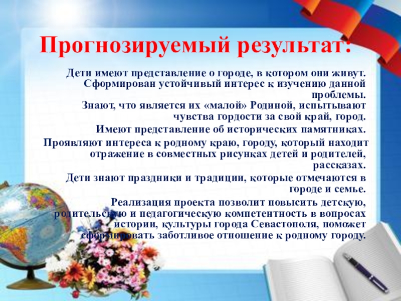 Реализация проекта позволит повысить детскую, родительскую и педагогическую компетентность в вопросах истории, культуры города Севастополя, поможет сформировать заботливое отношение к родному городу.