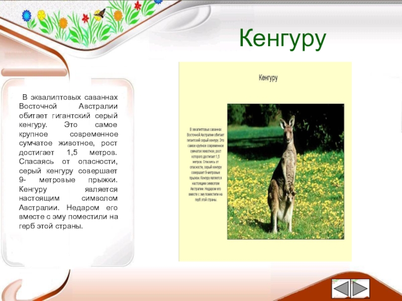 В эквалиптовых саваннах Восточной Австралии обитает гигантский серый кенгуру. Это самое крупное современное сумчатое животное, рост достигает 1,5 метров. Спасаясь от опасности, серый кенгуру совершает 9- метровые прыжки. Кенгуру является настоящим символом Австралии. Недаром его вместе с эму поместили на герб этой страны.