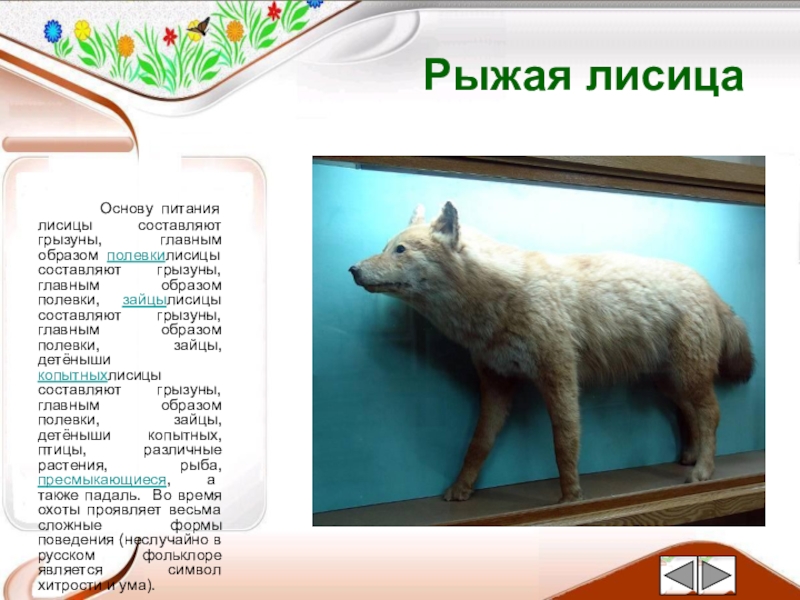Основу питания лисицы составляют грызуны, главным образом полевкилисицы составляют грызуны, главным образом полевки, зайцылисицы составляют грызуны, главным образом полевки, зайцы, детёныши копытныхлисицы составляют грызуны, главным образом полевки, зайцы, детёныши копытных, птицы, различные растения, рыба, пресмыкающиеся, а также падаль. Во время охоты проявляет весьма сложные формы поведения (неслучайно в русском фольклоре является символ хитрости и ума).