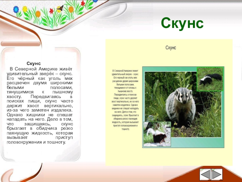 В Северной Америке живёт удивительный зверёк – скунс. Его чёрный как уголь мех расцвечен двумя широкими белыми полосами, тянущимися к пышному хвосту. Передвигаясь в поисках пищи, скунс часто держит хвост вертикально, из-за чего заметен издалека. Однако хищники не спешат нападать на него. Дело в том, что защищаясь, скунс брызгает в обидчика резко пахнущую жидкость, которая вызывает приступ головокружения и тошноту.