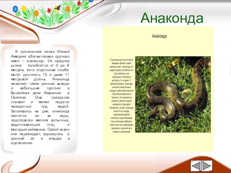 В тропических лесах Южной Америки обитаетсамая крупная змея – анаконда. Её средняя длина колеблется от 5 до 6 метров, хотя отдельные осыби могут достигать 10 и даже 11 метровой длины. Анаконда населяет тихие речные заводи и небольшие протоки в бассейнах реки Амазонки и Ориноко Она прекрасно плавает и может подолгу находиться под водой. Затаиваясь на дне, анаконда охотится из за сады, подстерегая мелких копытных, водоплавающих птиц и молодых кайманов. Сухой сезон она пережидает, зарывшись в донный ил и впадая в оцепенение.