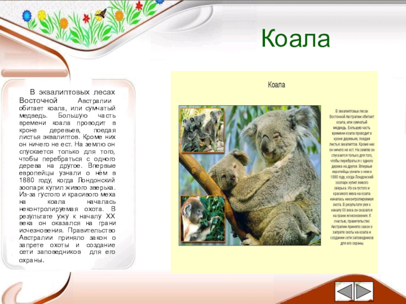 В эквалиптовых лесах Восточной Австралии обитает коала, или сумчатый медведь. Большую часть времени коала проводит в кроне деревьев, поедая листья эквалиптов. Кроме них он ничего не ест. На землю он спускается только для того, чтобы перебраться с одного дерева на другое. Впервые европейцы узнали о нём в 1880 году, когда Лондонский зоопарк купил живого зверька. Из-за густого и красивого меха на коала началась неконтролируемая охота. В результате ужу к началу ХХ века он оказался на грани исчезновения. Правительство Австралии приняло закон о запрете охоты и создание сети заповедников для его охраны.