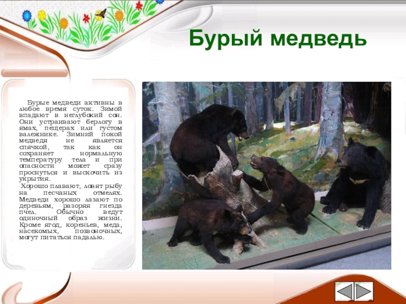 Бурые медведи активны в любое время суток. Зимой впадают в неглубокий сон. Они устраивают берлогу в ямах, пещерах или густом валежнике. Зимний покой медведя не является спячкой, так как он сохраняет нормальную температуру тела и при опасности может сразу проснуться и выскочить из укрытия.