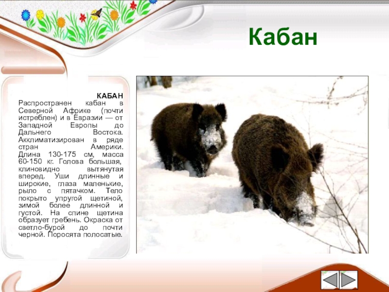КАБАН Распространен кабан в Северной Африке (почти истреблен) и в Евразии — от Западной Европы до Дальнего Востока. Акклиматизирован в ряде стран Америки. Длина 130-175 см, масса 60-150 кг. Голова большая, клиновидно вытянутая вперед. Уши длинные и широкие, глаза маленькие, рыло с пятачком. Тело покрыто упругой щетиной, зимой более длинной и густой. На спине щетина образует гребень. Окраска от светло-бурой до почти черной. Поросята полосатые.