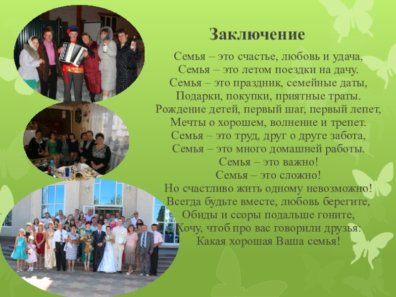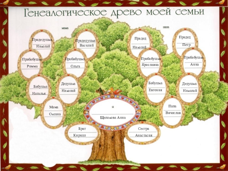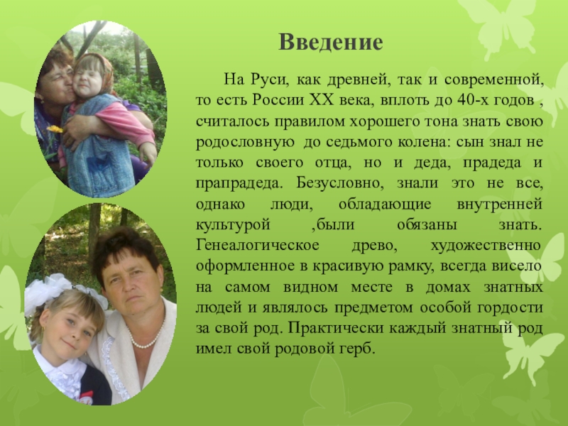 Семья - это продолжение нашего рода. Начало его уходит в далекое прошлое. В нем, в прошлом, лица близких и дорогих вашей семье людей. Они подарили жизнь вашим родителям и, благодаря судьбе, наши родители смогли встретить друг друга.